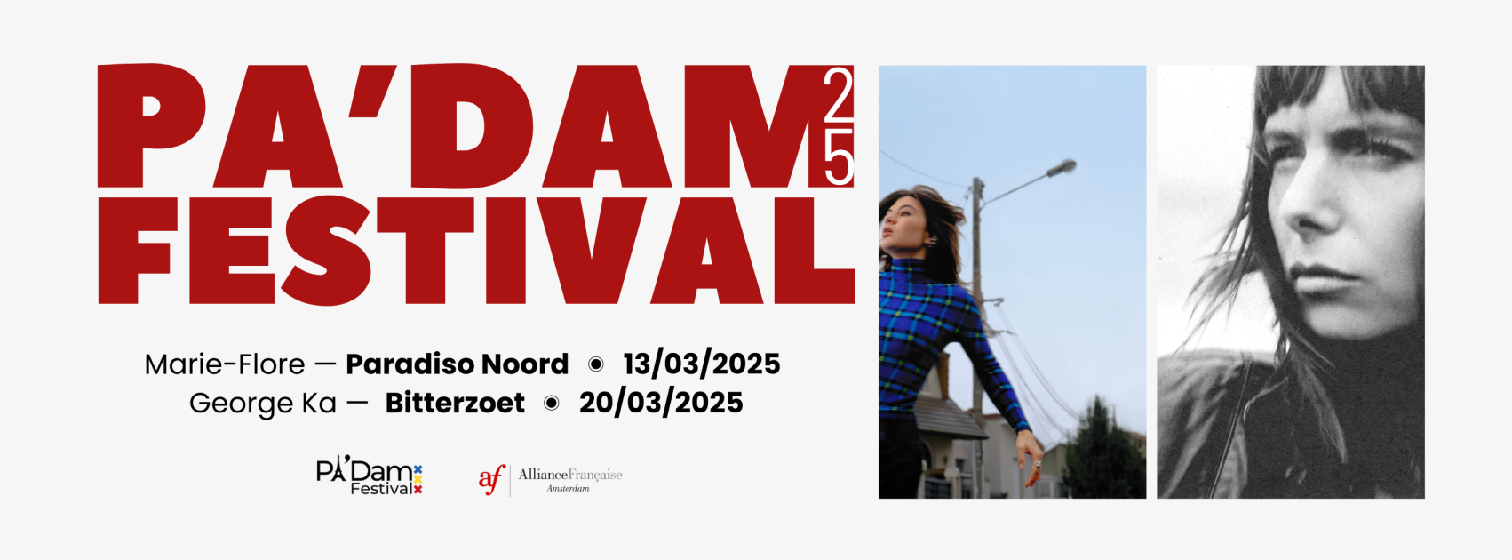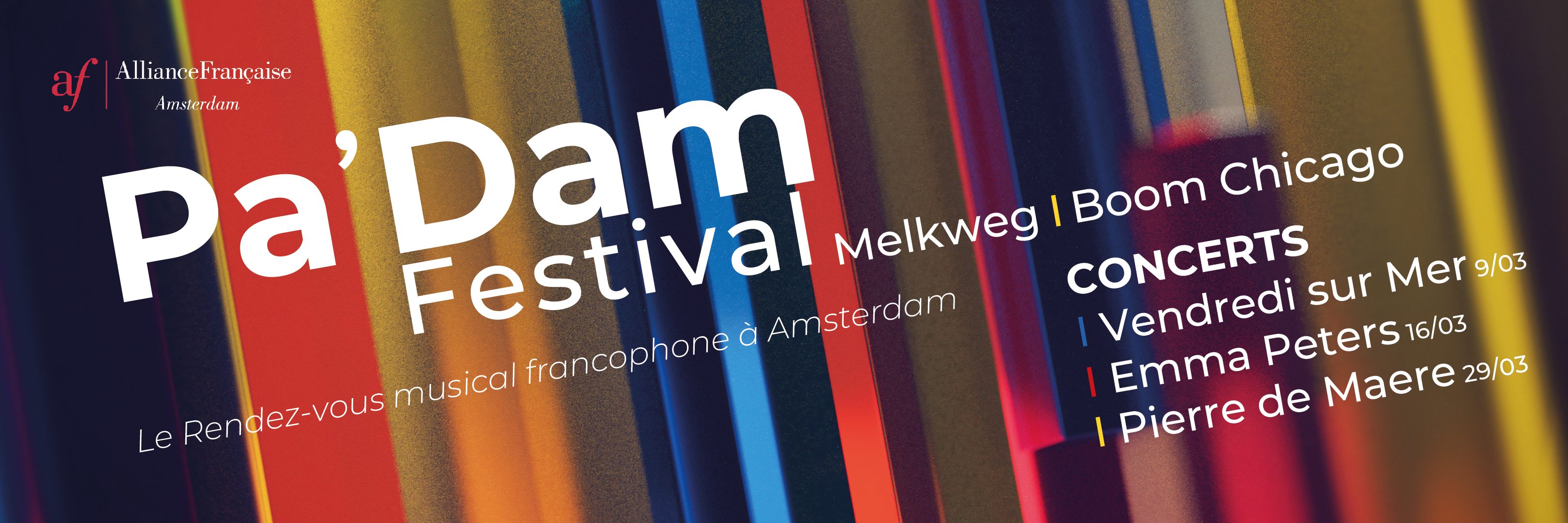 Fort du succès du Festival Utopies en 2022, l'Alliance Française d'Amsterdam lance en mars 2023 Pa’Dam : le premier festival aux Pays-Bas dédié à la scène musicale francophone !  À festival d’exception, il fallait une programmation digne de ce nom. À l'occasion du mois de la francophonie, trois artistes se produiront pour la première fois aux Pays-Bas durant ce mois de musique, de célébrations et de partage !  C’est la chanteuse suisse Vendredi sur Mer qui a inauguré Pa’Dam au Boom Chicago, suivie de l'artiste française Emma Peters et de la révélation Belge Pierre de Maere au Melkweg.