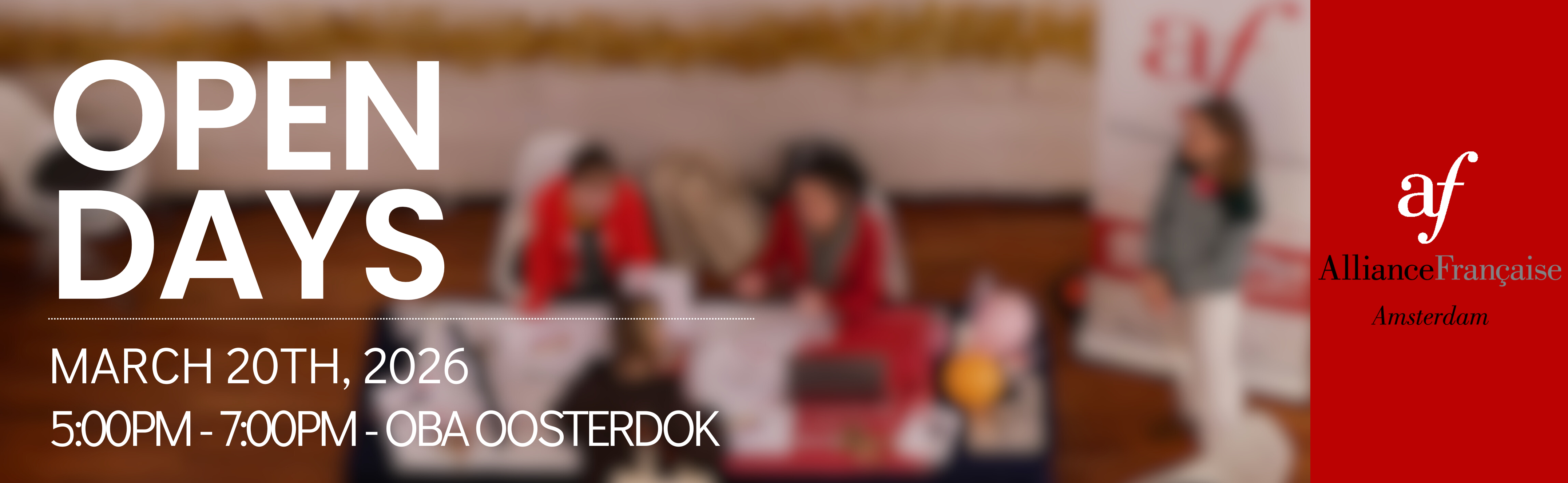 Rejoignez-nous pour les portes ouvertes et rencontrez l'équipe de l'Alliance Française Amsterdam ! Profitez de ce moment pour poser