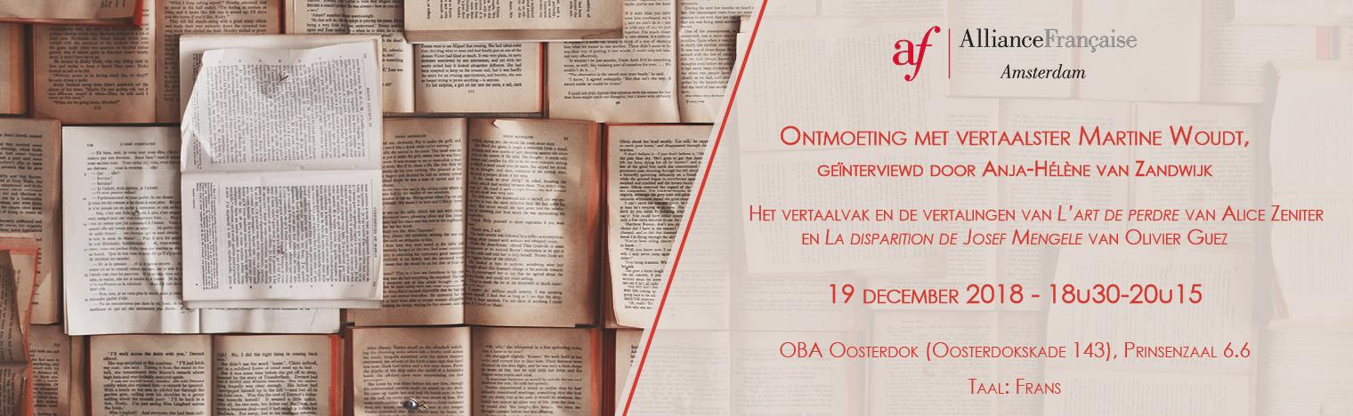 De Alliance Française Amsterdam organiseert een ontmoeting met de vertaalster Martine Woudt, ze zal worden geïnterviewd door Anja-Hélène van Zandwijk, docente gespecialiseerd in hedendaagse Franse literatuur. De onderwerpen van de ontmoeting zijn het vertaalvak, de taal- en cultuurspecifieke moeilijkheden, en de meest recente vertalingen van Martine Woudt - De kunst van het verliezen van Alice Zeniter en De verdwijning van Josef Mengele van Olivier Guez.