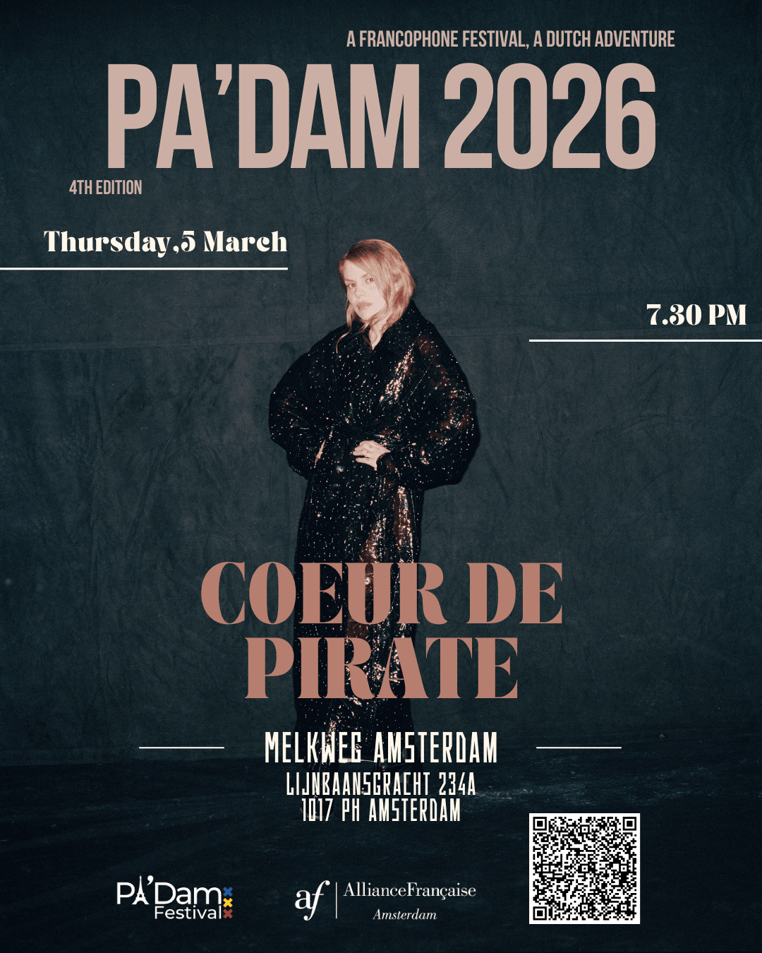 Al meer dan 15 jaar is Coeur de Pirate een begrip in de Canadese popmuziek en een troost voor gebroken harten. Ter ere van de Francophonie-maand treedt Cœur de pirate op tijdens het Pa’Dam Festival voor een exclusief concert in de Melkweg.